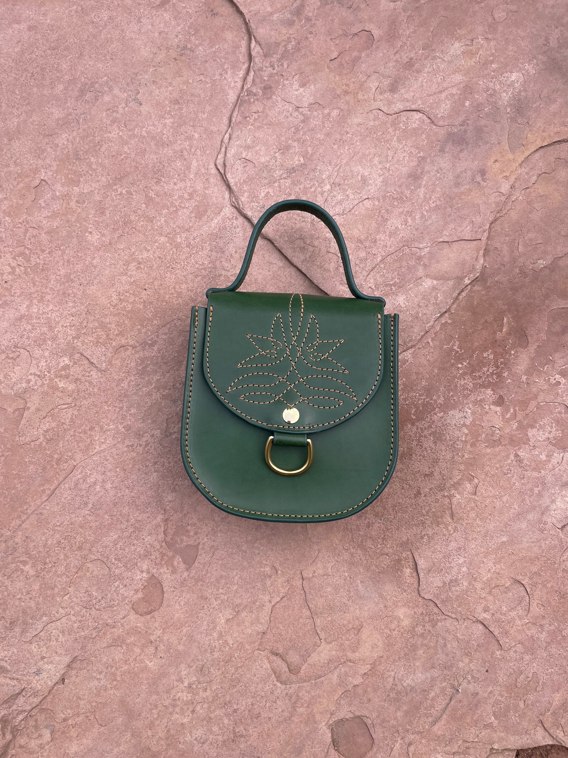 The Ellis is a mini Western hand bag includes an interior card holder and features exquisite contrast boot stitch design. A flap closure with a magnet and D ring pull keep all your essential secure. The perfect go to small bag with enough room for a cell phone, keys and lip stick and credit card. Include a super cute integrated top handle and an additional cross body strap.